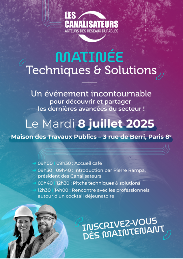 📍 Le mardi 8 juillet 2025, les Canalisateurs vous donnent rendez-vous à la Maison des Travaux Publics (3 rue de Berri – Paris 8e) pour une Matinée Techniques & Solutions.